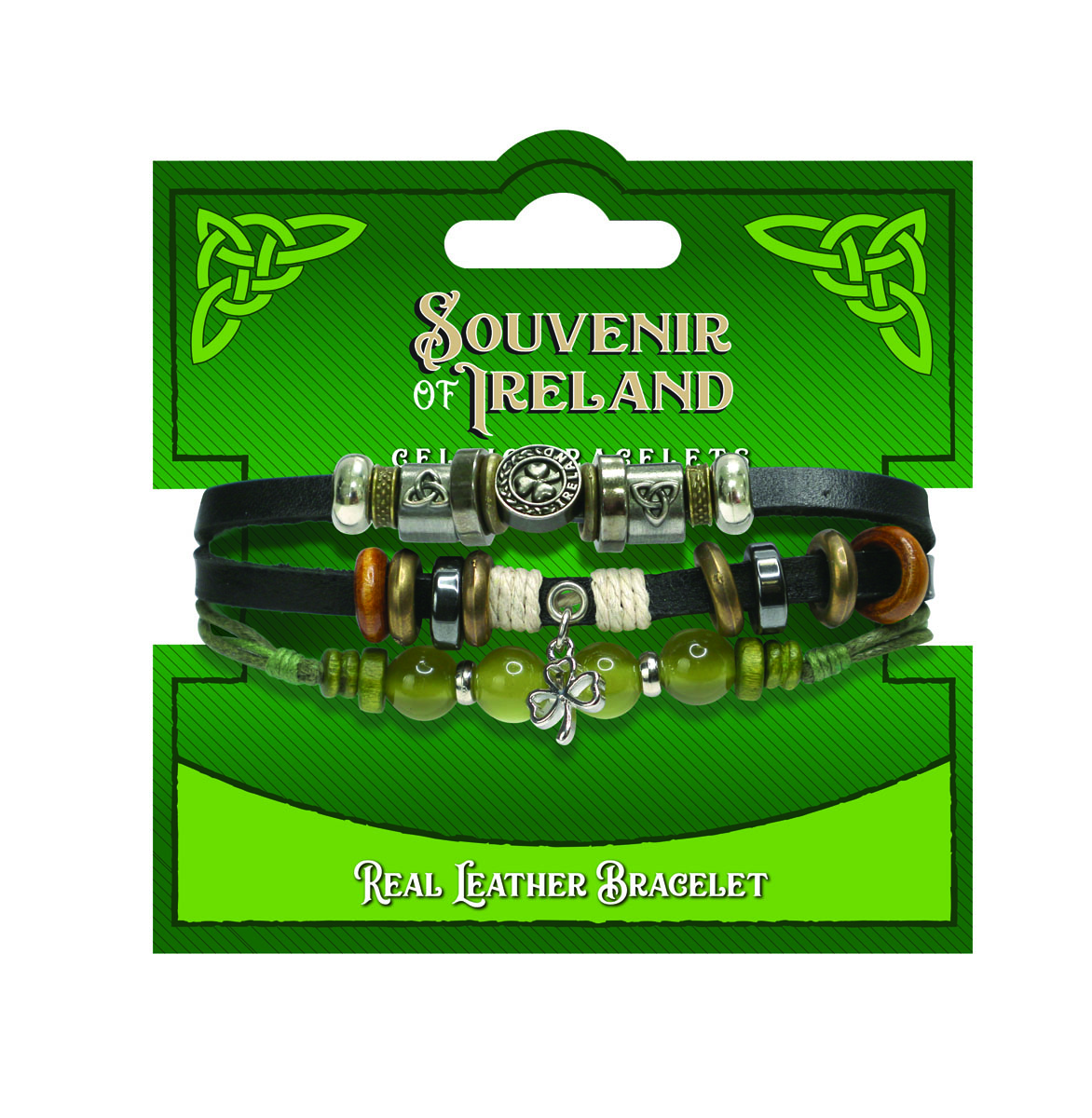 Black Leather/Marble Bracelet W/Shamrock Round Icon W/Shamrock Charm