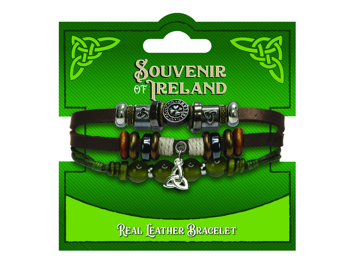 Brown Leather/Marble Bracelet W/Shamrock Round Icon W/Trinity Knot Charm